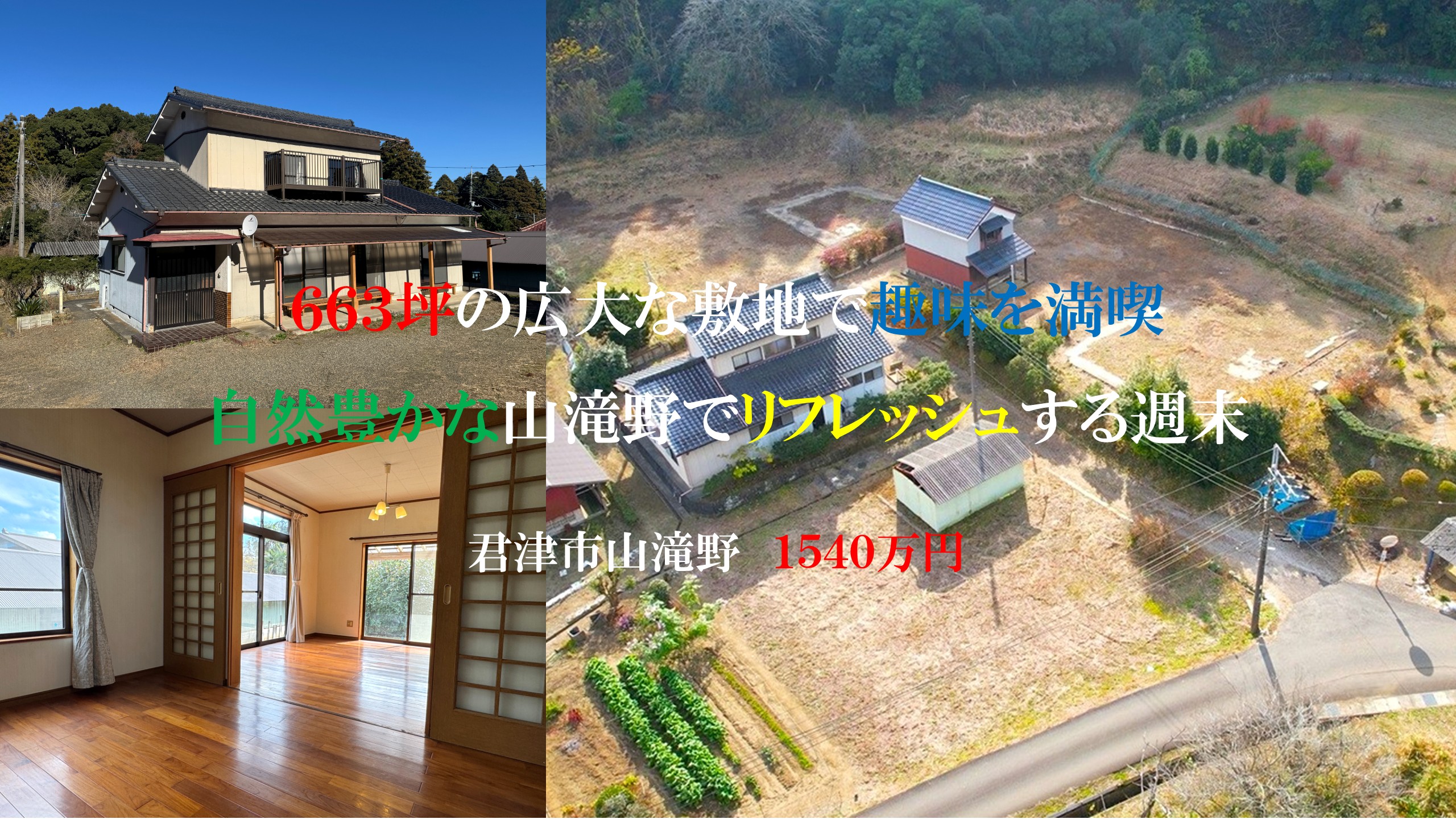 富津市志駒・静寂の中に佇む和の邸宅のYouTube動画を公開しました。コンセプトは、都会の喧騒から離れ、週末はゆっくりと。都会では得ることのできない735坪の広大なスケールに秋には真っ赤な紅葉が色付くもみじロード。静かな時が流れるロケーションと落ち着いた和の佇まいをぜひ現地で。
