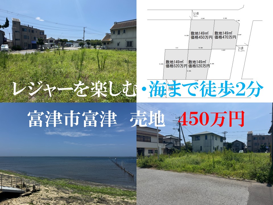 富津市富津・売地 海まで徒歩2分・富津公園まで徒歩2分 敷地は45坪・4筆合計180坪でも購入可 休日は海水浴や潮干狩りなどを楽しむ